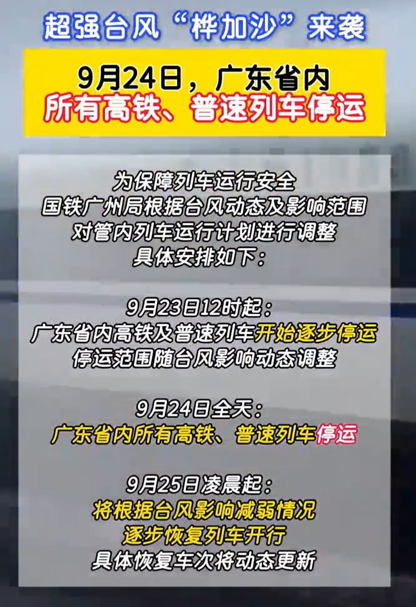 “五停”范围扩大:佛山、珠海、江门、东莞23日起全面停课、停工、停运;广州、深圳等地全市中小学23日停课、停工,待台风橙色/红色预警触发。