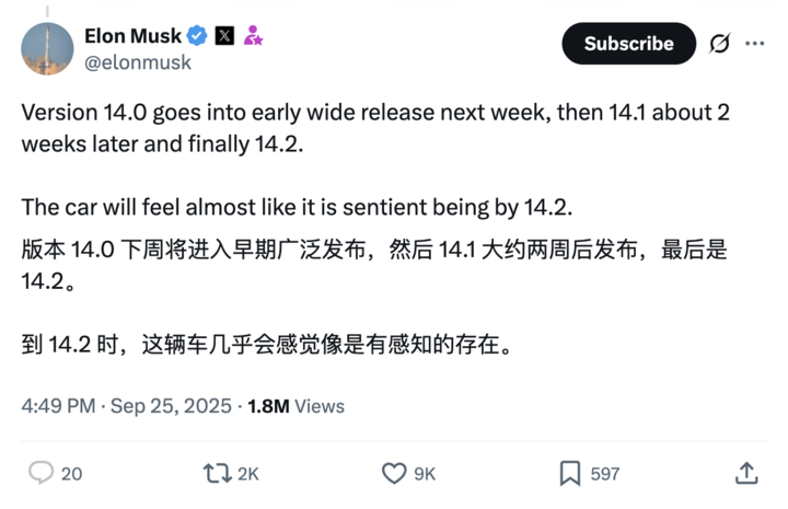 至于 V14.2,马斯克未给出明确时间,但强调届时体验将迎来「质变」,甚至让人感觉系统「富有灵性」。
