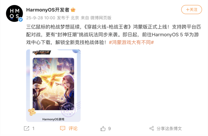 华为 HarmonyOS 开发者官方微博今日宣布,腾讯手游《穿越火线-枪战王者》鸿蒙版正式上线,支持跨平台匹配对战,同时「封神狂潮」挑战玩法同步开放。