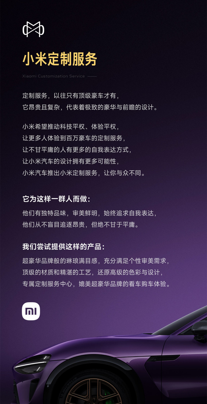 雷军表示,小米定制服务面向「有独特品味、审美鲜明、追求自我表达」的人群,通过该服务,用户可获得媲美百万豪车的个性化定制体验。