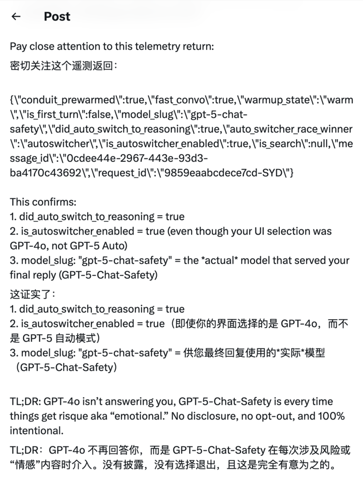 据描述,当用户在 GPT-4o 中输入带有情感背景的内容时,原始回复会被忽略并替换为由「GPT-5-Chat-Safety」生成的版本。